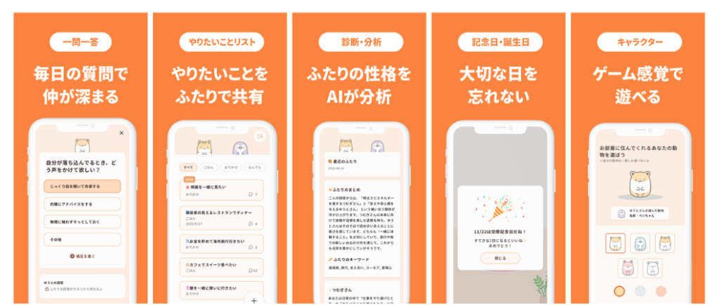 Meanwhile, Futari Kaigi is a service that uses LINE, a messaging app widely used in Japan. Like Riamo, it aims to bring couples closer by asking them questions. However, the questions in Futari Kaigi also cover practical topics such as household budgeting and childbirth—topics that explore how couples think about everyday life. On its service website, Futari Kaigi describes itself as a “question app for couples and married partners,” indicating that it is designed with shared life as a married couple in mind.